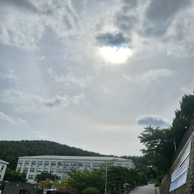 해 주변에 환처럼 무지개가 살짝 보이네요.