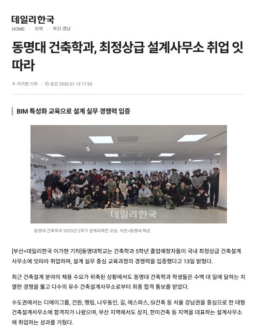 동명대 건축학과, 최정상급 설계사무소 취업 잇따라