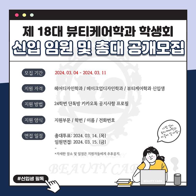 안녕하십니까. 제 18대 뷰티케어학과 학생회 입니다.