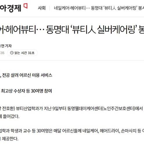 아시아 경제 신문에 동명대학교 뷰티산업학과봉사활동 기사
