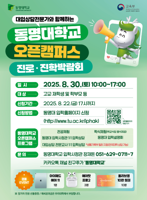 동명대학교에서 수험생과 학부모를 대상으로 오픈캠퍼스를 개최합니다. 학과별 전공체험, 대입상담 전문가 입학상담, 설명회 등 다양한 프로그램이 준비되어 있습니다.