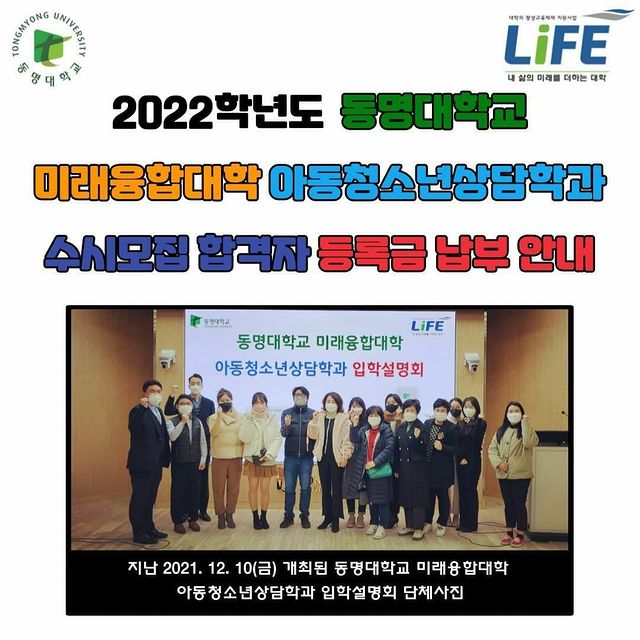 2022학년도 동명대학교 미래융합대학 아동청소년상담학과 수시모집 합격자 등록금(예치금) 납부 안내