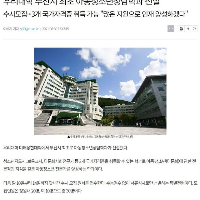 [TU-TIMES] 우리대학 부산시 최초 아동청소년상담학과 신설