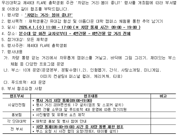 2026년 총학생회 '차없는 거리:봄이 좋냐?'행사에 따른 협조 요청안내