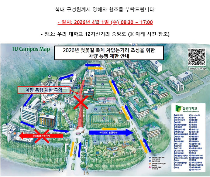 2026년 총학생회 「차 없는 거리: 봄이 좋냐?」 행사를 위한 학내 차량 통행 제한 안내