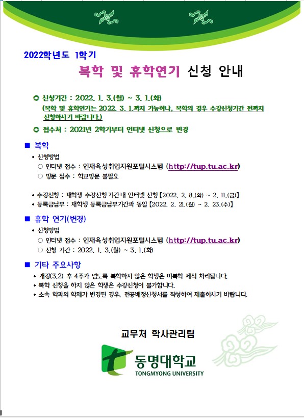 2022학년도 1학기 복학 및 휴학연기 신청 안내