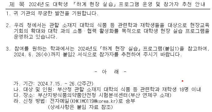 2024년도 대학생 「하계 현장 실습」프로그램 운영 및 참가자 추천 안내