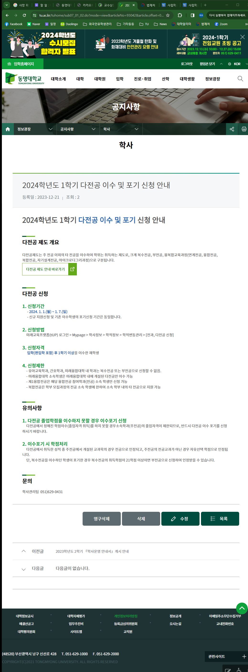 2024학년도 1학기 다전공(복수전공/부전공/연계전공/융합전공/복합전공) 이수신청 및 포기신청