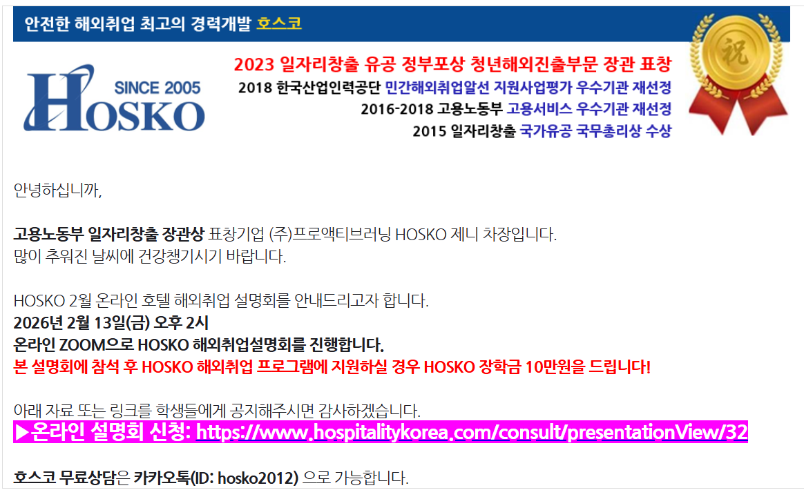 HOSKO_ 2월 온라인 호텔 해외취업 설명회