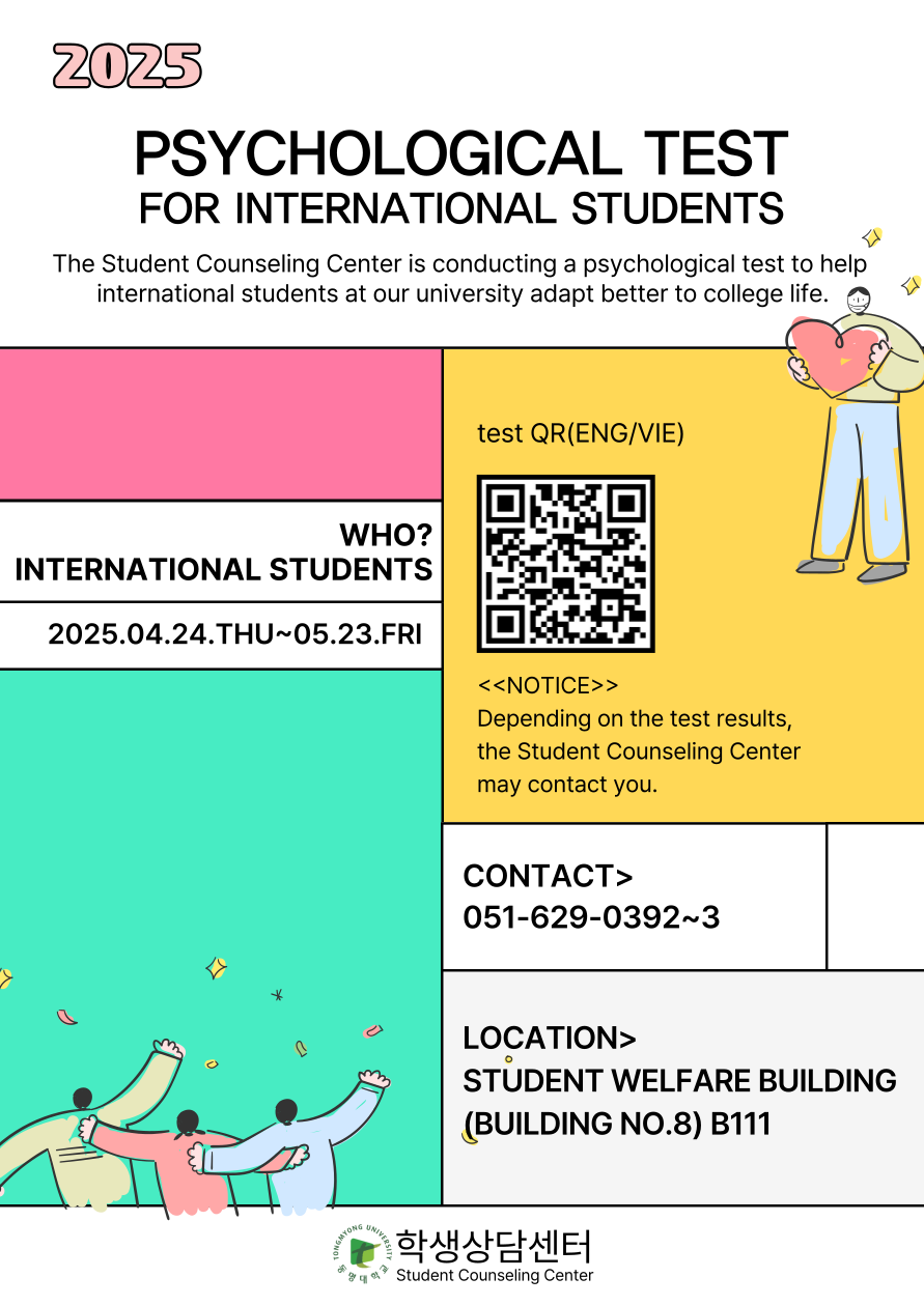 학생상담센터에서는 본교 재학 중인 외국인 유학생들의 대학적응력 향상을 위하여 심리검사를 진행하고자 합니다.