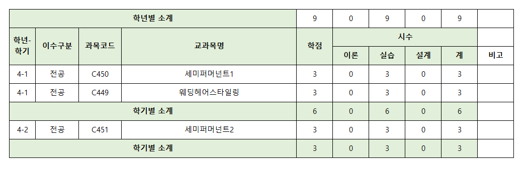 2025학년도 뷰티예술대학 헤어디자인학과 교육과정표