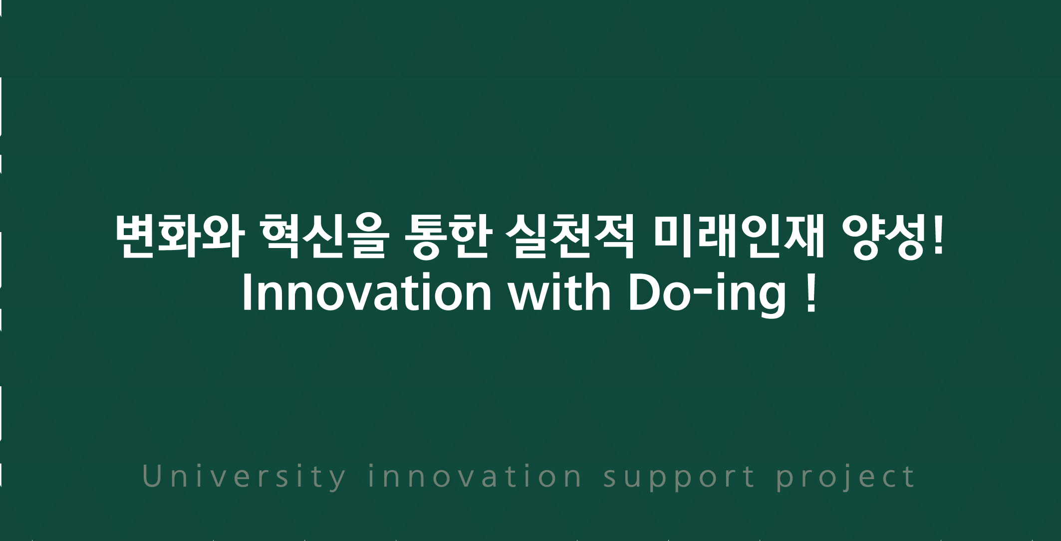 | 동명대학교는 4차 산업혁명시대에 창조적으로 대응하기 위해 대학의 기본역량 강화 및 대학 특성화를 바탕으로 지역의 필요한 인재를 양성하여 지역사회와 국가발전에 기여하는 지역 명문 강소대학으로 발전해 나가고 있습니다. 이러한 혁신 노력을 통해 동명대학교는 지난 1,2주기 대학혁신지원사업에 이어 3주기(2025~2027년) 대학혁신지원사업에 선정되어 실천적 미래인재 양성을 위한 교육 혁신을 지속하고 있습니다. 대학혁신지원사업은 ‘변화와 혁신을 통한 실천적 미래인재 양성’이란 사업목표를 달성하기 위해 교육(Education) 혁신, 시스템(System) 혁신, 거버넌스(Governance) 혁신이란 3대 ESG 혁신방향을 수립하였으며, 대학 혁신지원사업의 성과가 대학혁신에 직접적인 기여를 할 수 있도록 우리대학 중장기 발전계획과 연계된 추진과제를 수행하고 있습니다. 우리대학은 끊임없는 교육혁신과 특성화 노력을 통하여 LINC+사업, SW중심대학 사업, 평생교육체제사업 등 국가재정사업을 수행하는 명실공히 지역을 선도하는 혁신대학으로 자리매김하고 있습니다. 동명대학교 대학혁신지원사업단은 앞으로도 끊임없는 혁신이 지속될 수 있도록 최선을 다하겠습니다. 대학혁신지원사업에 대한 많은 관심과 참여를 부탁드립니다. 감사합니다. 대학혁신지원사업단장 차지철 |