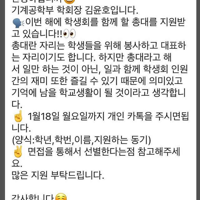 기계공학부의 총대 지원이 오늘까지입니다 여러분의 많은 지원 부탁드립니다!