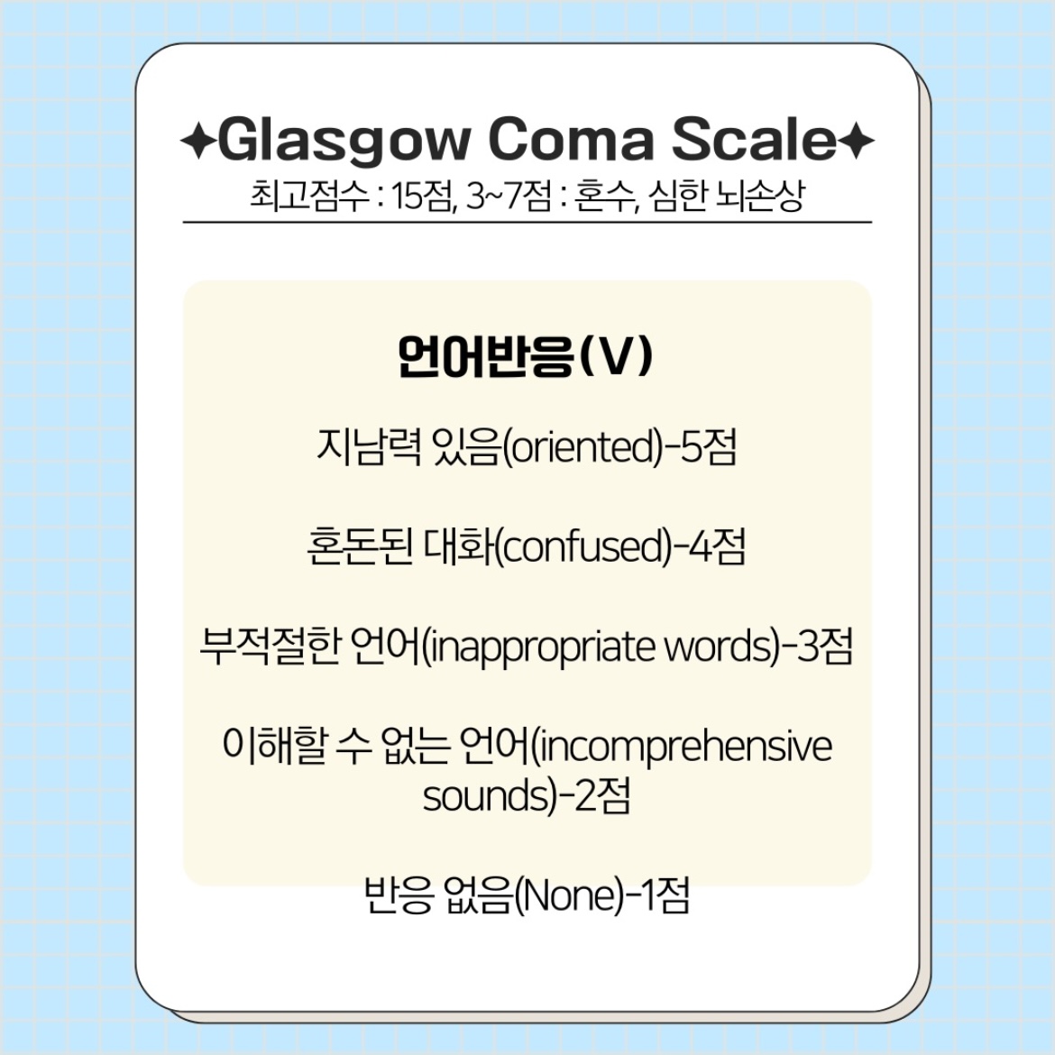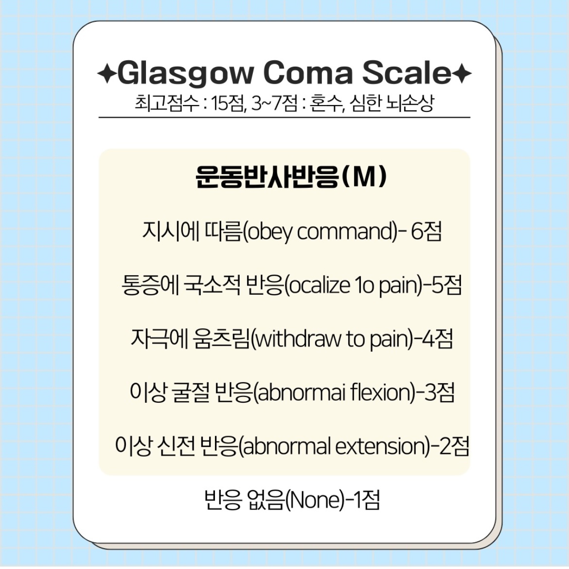 최고 15점 / 3~7점 = 혼수, 심한 뇌손상