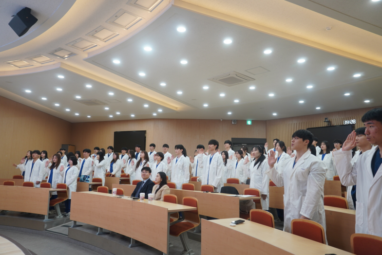 작업치료사 선서식 준비와 함께 선서문 낭독 및 가운 착복이 진행되며 예비 작업치료사로서의 책임감과 사명감을 되새기는 뜻깊은 시간을 가졌습니다.