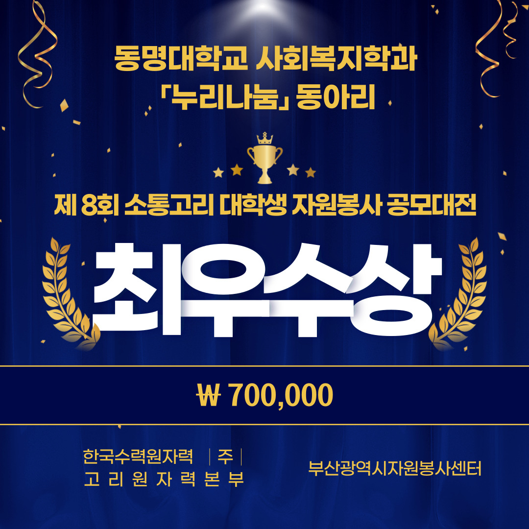 제8회 소통고리 대학생 자원봉사 공모대전 최우수상 수상〈언어발달 지체 영유아의 언어학습 프로그램 "동화 속 바름(발음) 놀이동산"(용당어린이집 7회기 진행)〉