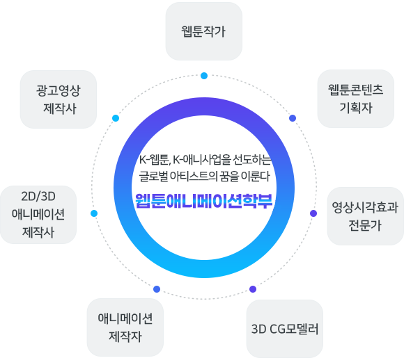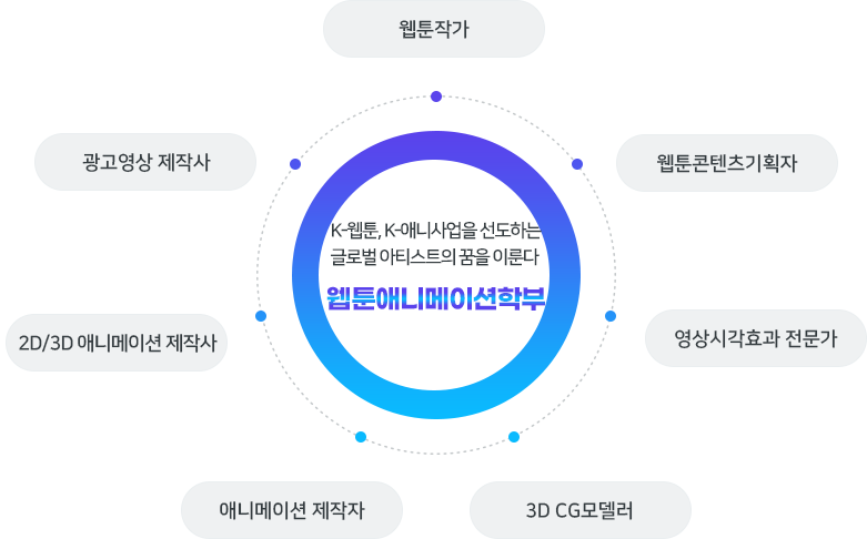 글로벌 문화콘텐츠산업의 창의적 인재를 양성하기 위해 신설된 Do-ing대학 웹툰ㆍ애니메이션학과는 인문학적 소양을 기반으로 콘텐츠 제작 기획력을 갖추고, 예술적 소양을 바탕으로 창의력, 표현능력을 키우며, 웹툰 제작, 애니메이션 제작, 캐릭터디자인, 일러스트 분야 교육과 함께 영상 연출, 영상편집, 영상 시각효과 등 실무자 중심 교육을 실천하여 진로의 폭을 넓히며 글로벌 리더로서의 아티스트를 양성하는 것을 목표로 합니다.