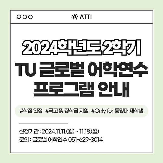 • INSTAGRAM 💛안녕하세요! 동명대학교 학생홍보대사 아띠 입니다!💛 💛안녕하세요! 동명대학교 학생홍보대사 아띠 입니다!💛 오늘은 TU 글로벌 어학연수 프로그램에 대해 알려드리고자 합니다! TU 글로벌 어학연수 프로그램이란? 우리대학 재학생의 국제화 역량을 향상시키고자 진행하는 프로그램입니다. 어학연수 프로그램에 대한 자세한 내용은 카드뉴스 참고 부탁드리며 영어를 못 하는 학생들도 연수 프로그램을 신청하는 데 문제가 없으므로 재학생 여러분들의 많은 관심과 지원 부탁드립니다! ▪️신청 기간: 2024.11.11.(월) ~ 11.18.(월) ▪️지원 자격 ▫️우리 대학 재학생 중 어학연수에 관심 있는 학생 누구나 ▫️장학금 지급 규정에 위배되지 않으며, 학칙에 징계 사실이 없는 학생 ▫️대학혁신 글로벌 어학연수 기 참여 학생은 신청 불가 ▫️파란사다리 해외연수 사업 참여 학생은 신청 가능 ▪️지원 방법 ▫️이메일 접수 (denniskim@tu.ac.kr) ▫️방문 신청 (동명대학교 국제교류처, 국제교류팀 / 21번 건물 101호) ▪️신청 서류 ▫️참가신청서 및 지원동기 1부 ▫️여권사본 (여권이 없는 학생은 반드시 여권 발급 신청 필요) ▫️재학증명서, 성적증명서 ▪️합격자 발표: 2024.11.22.(금) 개별통보 및 홈페이지 공지 ▪️문의처 ▫️국제교류팀 (국제산학협력관 21번 건물 101호) ▫️051-629-3014 #동명대 #동명대학교 #2024학년도 #2학기 #tu #글로벌 #어학연수 #프로그램 #필리핀 #세부 #클락 #동명소식 #학생홍보대사 #아띠 #tongmyonguniversity #tongmyong #tu