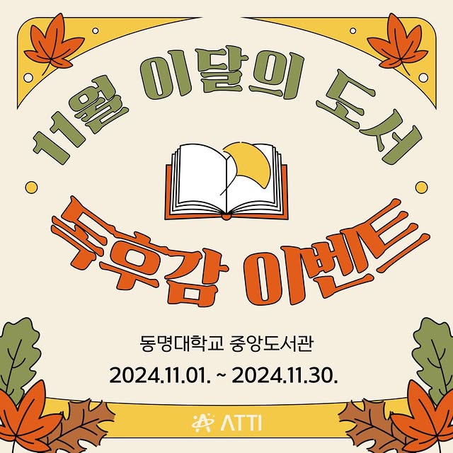 • INSTAGRAM 💛안녕하세요! 동명대학교 학생홍보대사 아띠 입니다!💛 💛안녕하세요! 동명대학교 학생홍보대사 아띠 입니다!💛 11월을 맞이하여 중앙도서관에서 진행하는 이달의 도서 독후감 이벤트에 대해 안내해 드리고자 합니다. 이달의 도서 독후감 이벤트란? 중앙도서관에서 매달 진행하는 이벤트로 추천도서를 읽고 독후감을 작성하면 1마일리지를 받을 수 있는 이벤트입니다. 독후감 작성 방법과 T-UP 신청 방법 등 자세한 내용은 카드뉴스 및 아래 사항 참고 부탁드리며, 많은 참여 부탁드립니다! 📚11월 이달의 도서 1. 일생에 한번은 헌법을 읽어라 2. 찬란한 멸종 3. 언젠가 우리가 같은 별을 바라본다면 4. 현명한 이타주의자 5. 화가가 사랑한 밤 6. 나는 세계와 맞지 않지만 #동명대학교 #동명대 #중앙도서관 #이달의도서 #독후감 #독후감쓰기 #독후감이벤트 #동명소식 #학생홍보대사 #아띠 #tongmyonguniversity #tongmyong #tu
