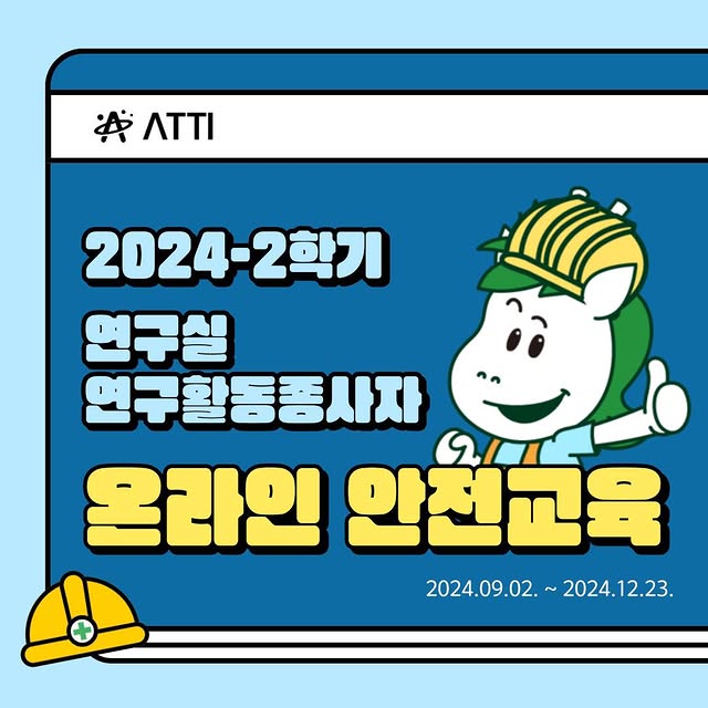 • BLOG 2024-2학기 연구실 연구활동종사자 온라인 안전교육 안내 안녕하세요! 동명대학교 홍보대사 아띠입니다! 여러분 연구실 연구활동종사자 온라인 안전교육 다들 이수하셨나요? 국가연구안전정보시스템 홈페이지에 방문하여 12월 23일까지 꼭 이수해야 한다고 합니다. 연구실안전교육시스템 사용방법 및 학과별 이수시간은 학교 홈페이지를 참고해 주시기 바랍니다.
