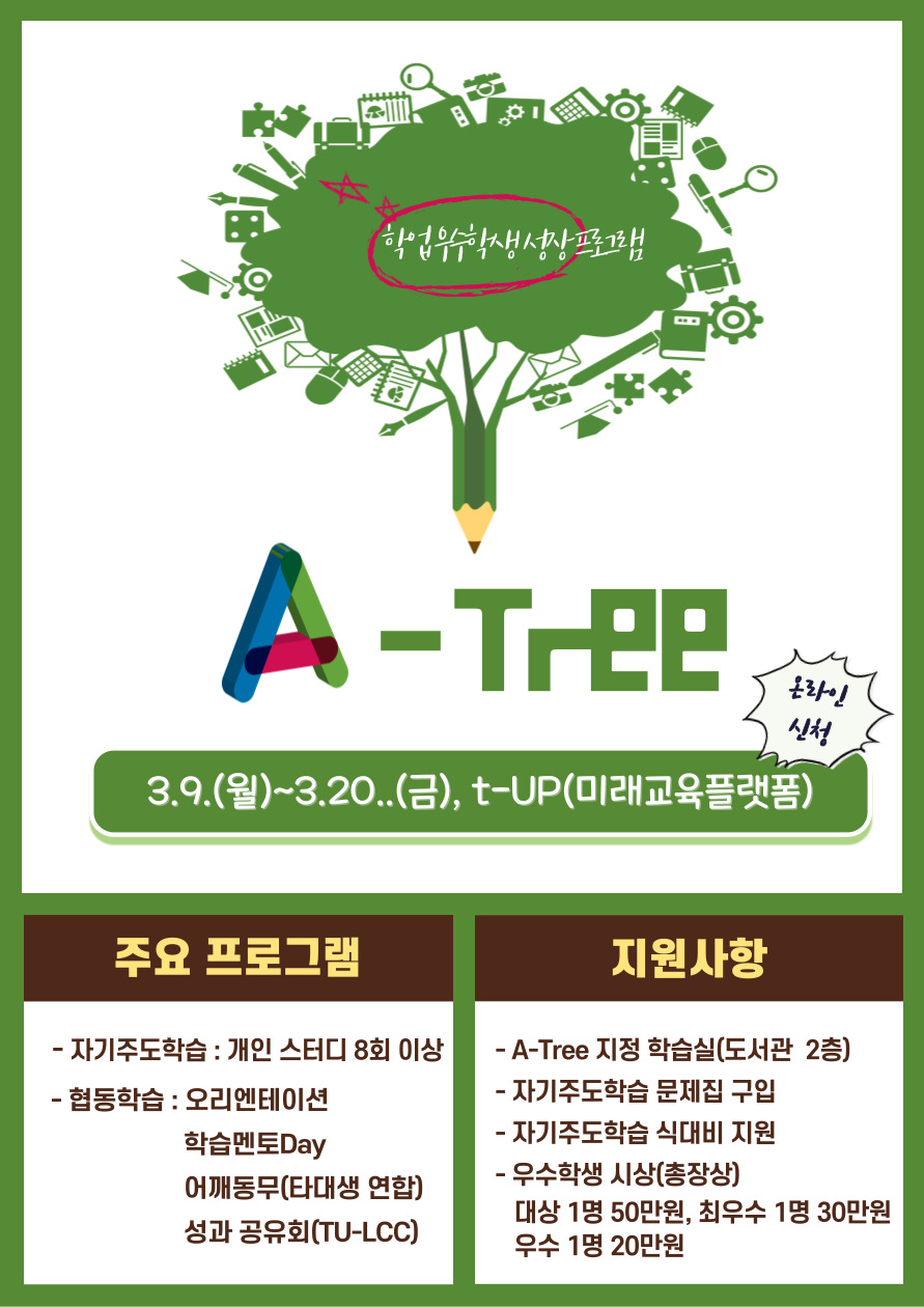 2026학년도 1학기 제6회 A-Tree(학업 우수학생 성장) 프로그램 참여 학생을 아래와 같이 모집하오니, 많은 참여 부탁드립니다.